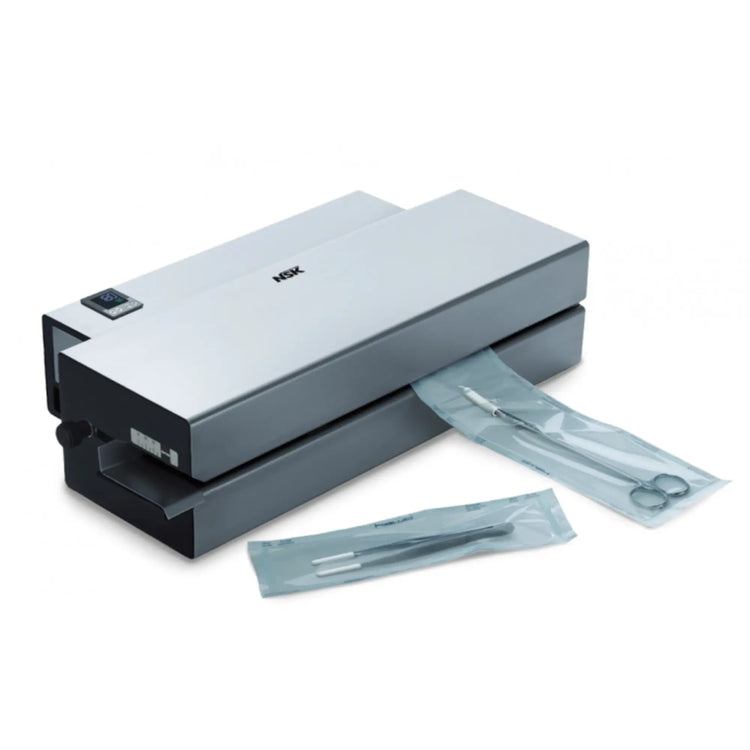 La nouvelle thermo-soudeuse NSK Seal rotative à cycle continu permet de sceller 10 mètres de sachet par minute. La cellule rotative s’active automatiquement à l’insertion du sachet dans la thermosoudeuse, permettant un scellage rapide et fiable pour un rendement élevé. Elle est idéale pour les cabinets et centres dentaires avec de grandes quantités d’instruments à stériliser.