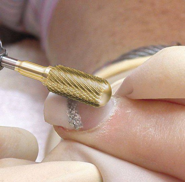 Cette fraise de pédicurie est recouverte d'une couche de nitrure de titane.