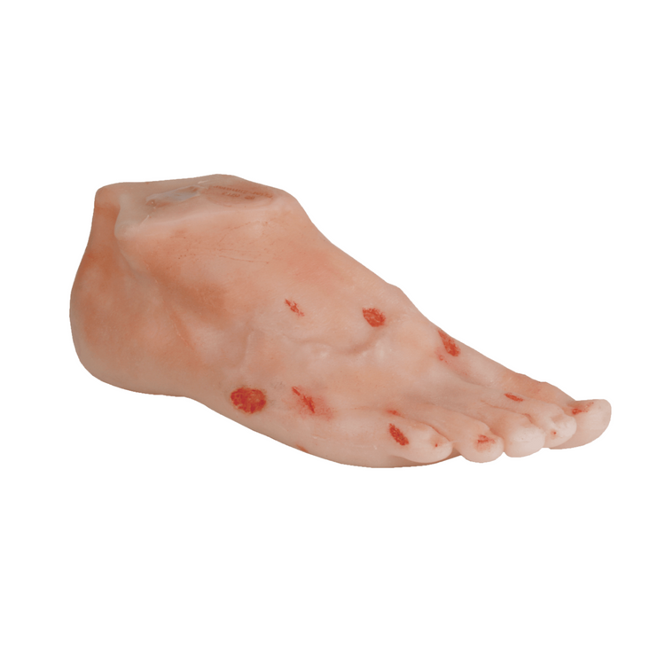 Réplique réaliste d'un pied adulte montrant différents stades d'ulcères diabétiques. Idéal pour démontrer l'importance des soins des pieds pour les diabétiques. Le matériau spécial offre non seulement un aspect réaliste, mais il convient également pour coller des pansements et des pansements sous vide.