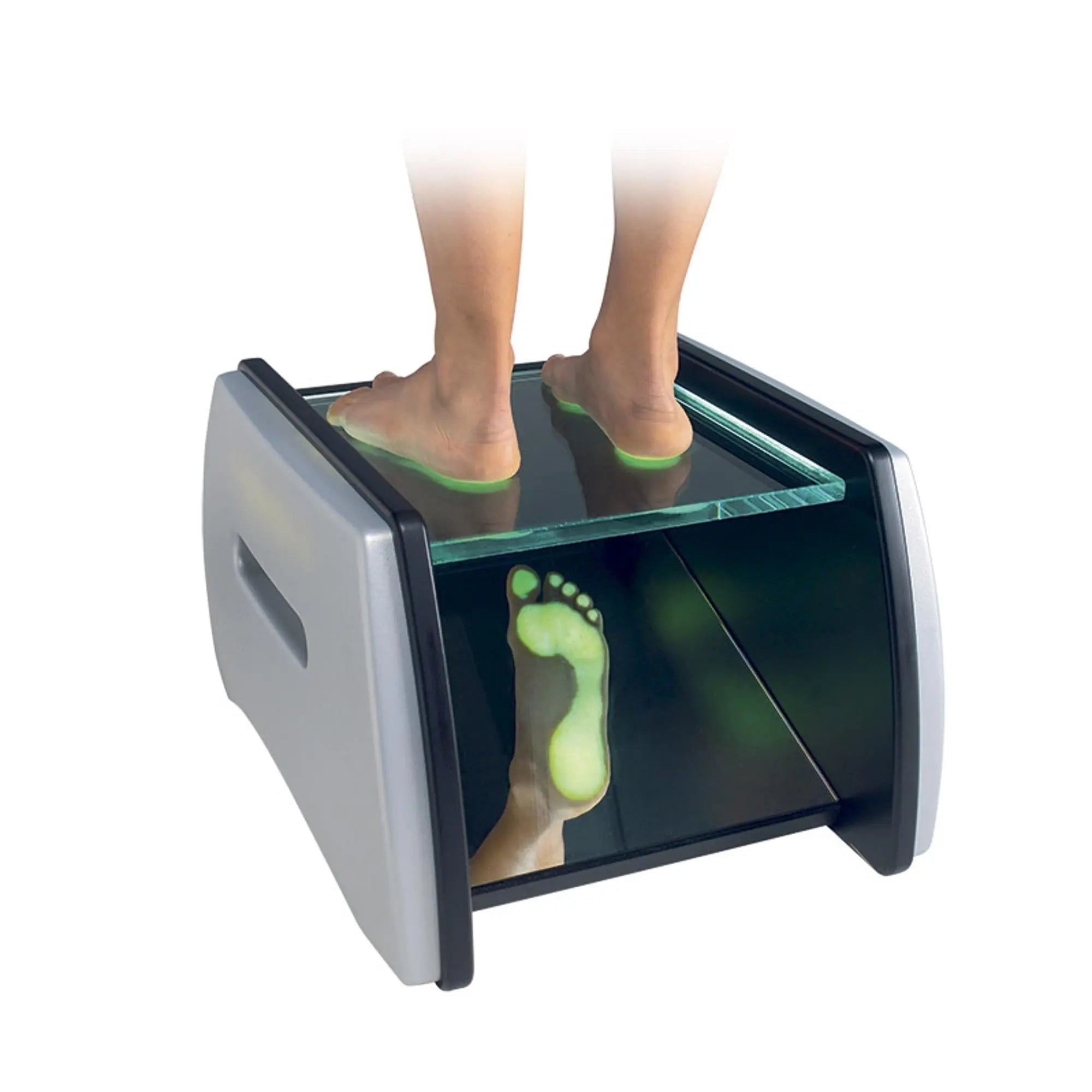 Il se compose d'une structure en bois laqué avec une partie supérieure transparente sous laquelle se trouve un miroir incliné reproduisant fidèlement la plante des pieds et mettant en évidence les différentes pressions des appuis.